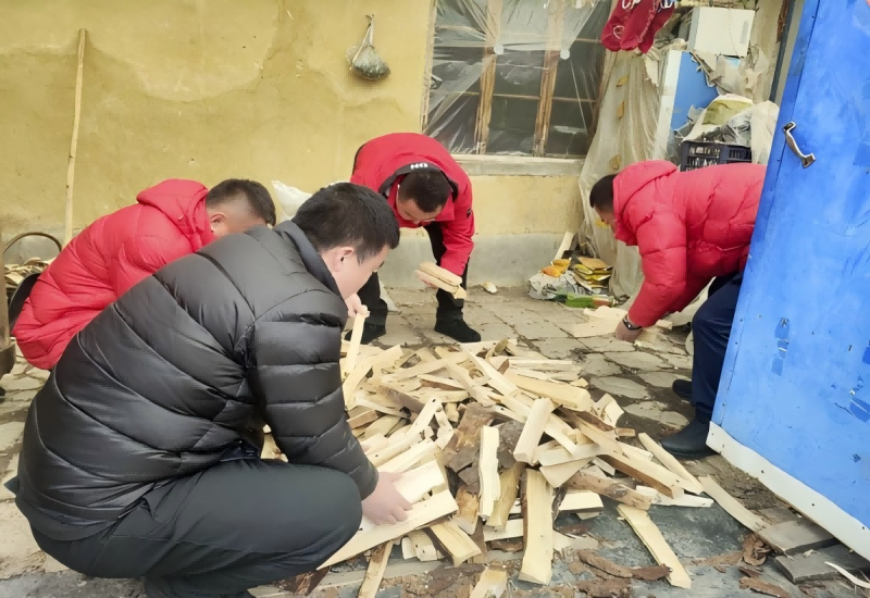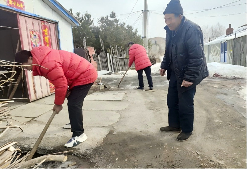 當(dāng)?shù)竭_老黨員家中,此時老人正坐在房前劈柴,看到隊員們的到來熱情地招呼大家。隊員們有的主動從老人手上接過斧子劈起柴,并將劈好的柴火擺放整齊;有的拿起掃帚把院子掃得干干凈凈;有的找來長把斧子和鐵鍬在門前鑿開一條排水溝方便積水排水??粗麧嵉脑郝?、暢通的水溝和老人的笑容,隊員們勞動的成就感油然而生。