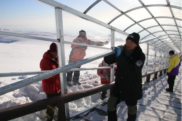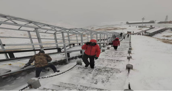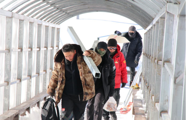 據了解,公司充分考量冬季長白山主峰風大雪大的極端氣候特點,避雪長廊最終確定采用穩(wěn)固的鋼架結構,搭配透明且韌性極強的耐力板,工程總長900米,寬2米,高約3米。該工程除焊接、切割等專業(yè)性較強的工序外,扛管、釘板等基礎工作均由一線員工完成。如何把近90噸施工材料運送到1442級臺階沿線是施工最大難題。受地理環(huán)境的限制,最終只能選擇人力運送,以每人50級臺階進行接力,把數十斤,甚至百斤重的鋼管和耐力板扛送到指定沿線施工點,他們每天接力往返近百次。凜冽寒風中,員工們肩頭的壓痕、凍紅的雙手,都化作了工程推進的堅實印記。