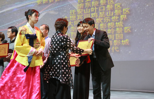 吉林省旅游發(fā)展委員會主任楊安娣為年度旅游景區(qū)人氣獎獲得單位頒獎