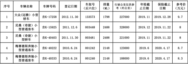 吉林省天池拍賣有限責(zé)任公司受長白山旅游股份有限公司的委托,對(duì)以下5臺(tái)公務(wù)用車進(jìn)行公開拍賣: