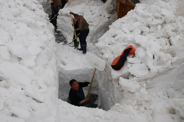 因長(zhǎng)白山晝夜溫差大,厚厚的積雪上還覆蓋冰層,極大增加了積雪清理的難度,于是大家鎬頭、鐵鍬、鋸一起上,遇雪塊就鋸,遇冰就刨,絲毫沒(méi)有影響清雪的進(jìn)度。在這里,黨員干部和黨員們奮力揮鍬,這如同無(wú)聲的沖鋒號(hào),鼓舞著每位清雪隊(duì)員。經(jīng)過(guò)3個(gè)小時(shí)的突擊,已經(jīng)清理近700米,兩側(cè)雪墻高3米。