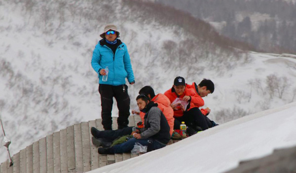 手套、棉衣、棉鞋早已被雪水和汗水浸濕,寒風(fēng)吹過(guò)格外的冷,累了就在雪墻上一靠、臺(tái)階上一坐,餓了把隨身攜帶的餐包拿出來(lái),簡(jiǎn)單吃一口。